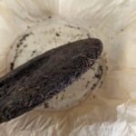 Appearance: Tightly compressed tea threads blended with some larger leaves and sturdy stems.